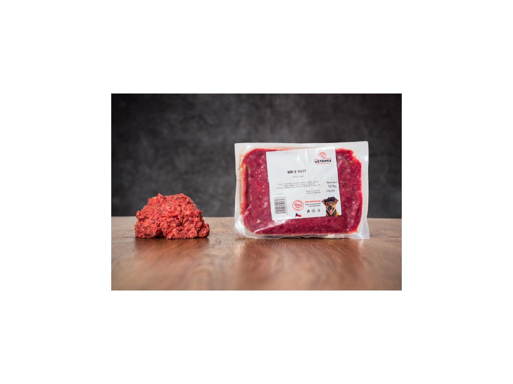 Kvalitní, lehce stravitelné králičí maso bohaté na hodnotné bílkoviny namleté najemno s kostmi a droby.